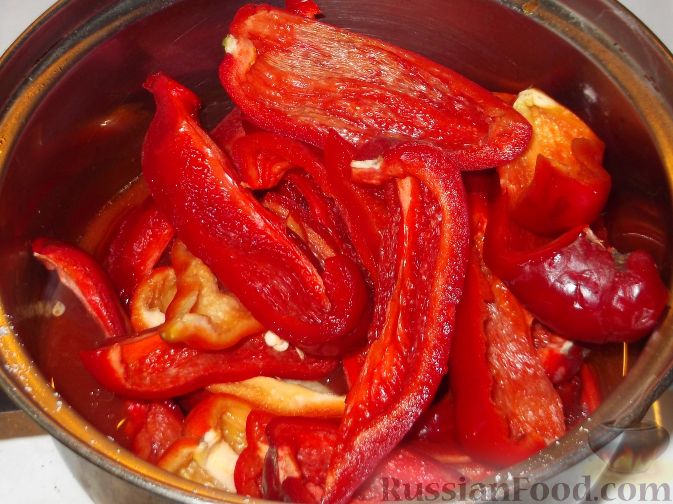 3) А пока промойте сладкий перец. Возьмите перец любого сорта, лучше красного цвета, и мякоть, желательно, чтобы была мясистой. Овощи должны быть свежие и не морщинистые. Промойте в проточной холодной воде, разрежьте на две половинки. Удалите семенную коробочку. Половинки нарежьте небольшими длинными кусочками.