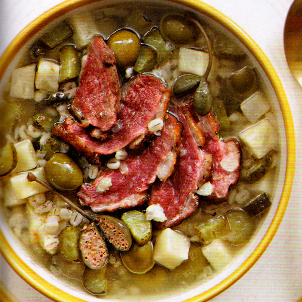 6 Одновременно поставьте на средний огонь сковороду с антипригарным покрытием, положите утиные грудки кожей вниз. Жарьте ровно 7 мин. Переверните, жарьте 3 мин. Дайте утке полежать под фольгой 5 мин. Нарежьте тонкими ломтиками, выложите в тарелки, залейте рассольником. Подавайте с оливками и каперсами