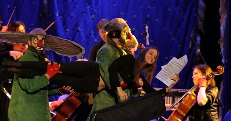 И снова скрипки, смычки, пюпитры, ноты… И рядом – красные носы, огромные телефоны и трехметровые шары, которыми играют зрители.