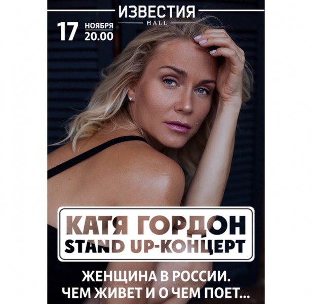 17 ноября в зале «Известия Hall» Катя Гордон представляет свою сольную программу «Stand up-концерт. Женщина в России. Чем живет и о чем поет». Катя Гордон расскажет о себе и о женщинах своего поколения в форме юмористического рассказа и песен собственного авторства.