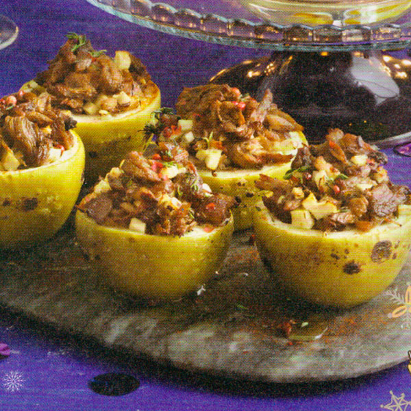 4 Разложите утиную начинку по яблокам с горкой. Поставьте начиненные яблоки в глубокий противень, влейте примерно литр воды. Разогрейте духовку до 180 °С и поставьте начиненные яблоки в центр духовки. Запекайте примерно 25 мин. Перед подачей полейте медом и еще поперчите.